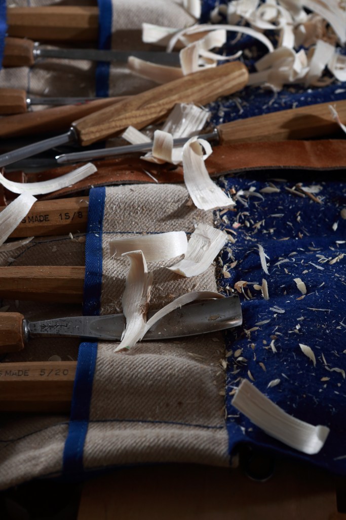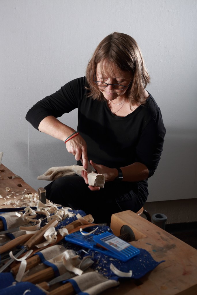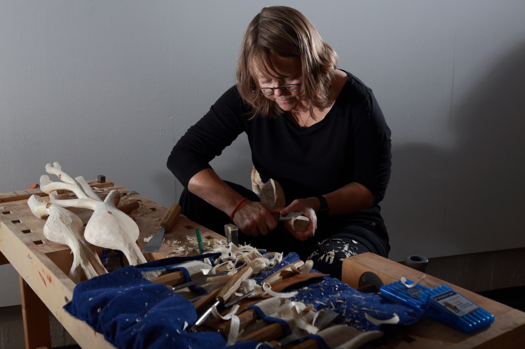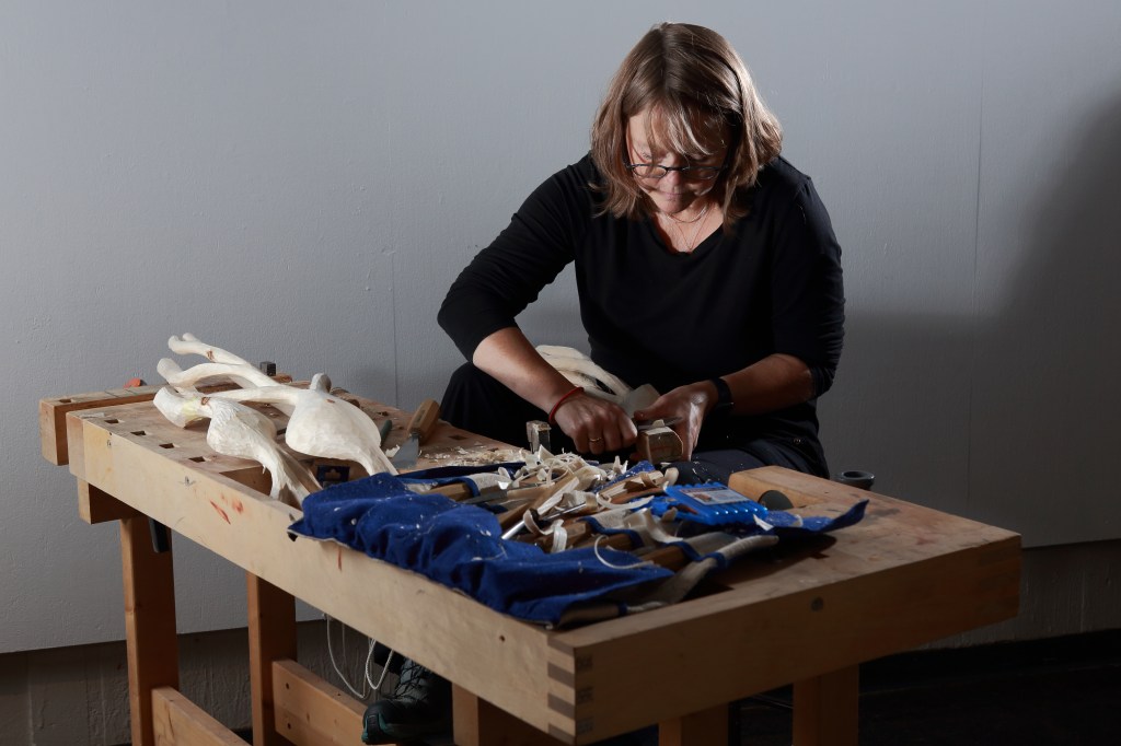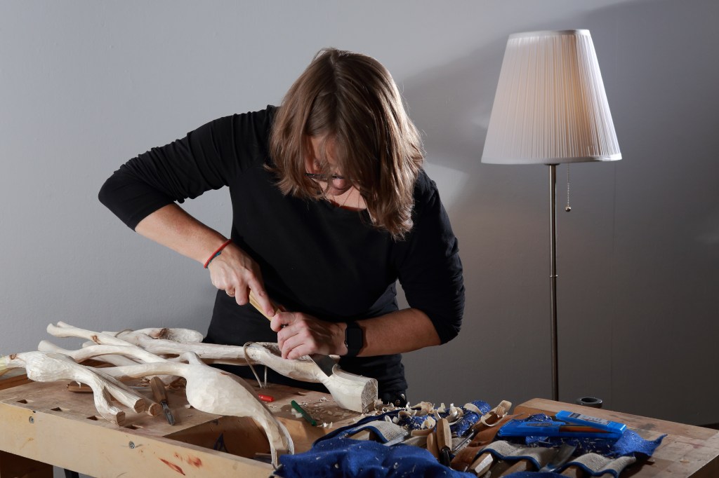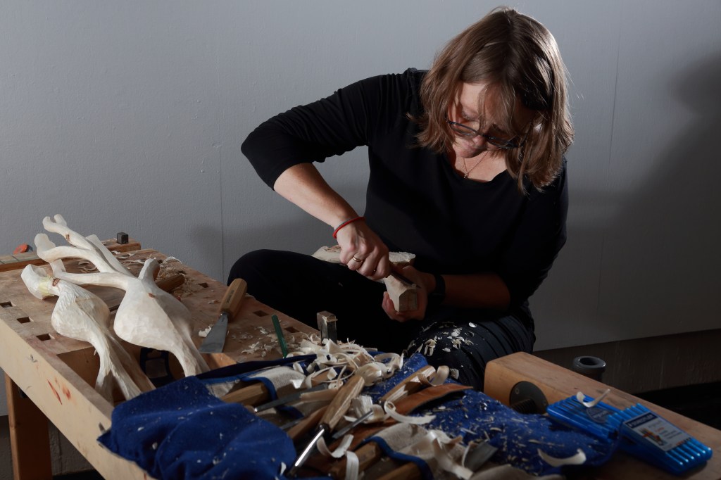 A couple of weeks into the exhibition I brought a workbench and the piece that would become Purkinje #9 into the exhibition space. I worked there to show the visitors the process. Groups of school children and students had organized tours and the school children got to try their hands carefully carving on Purkinje #9.