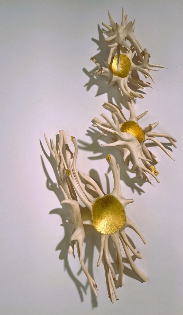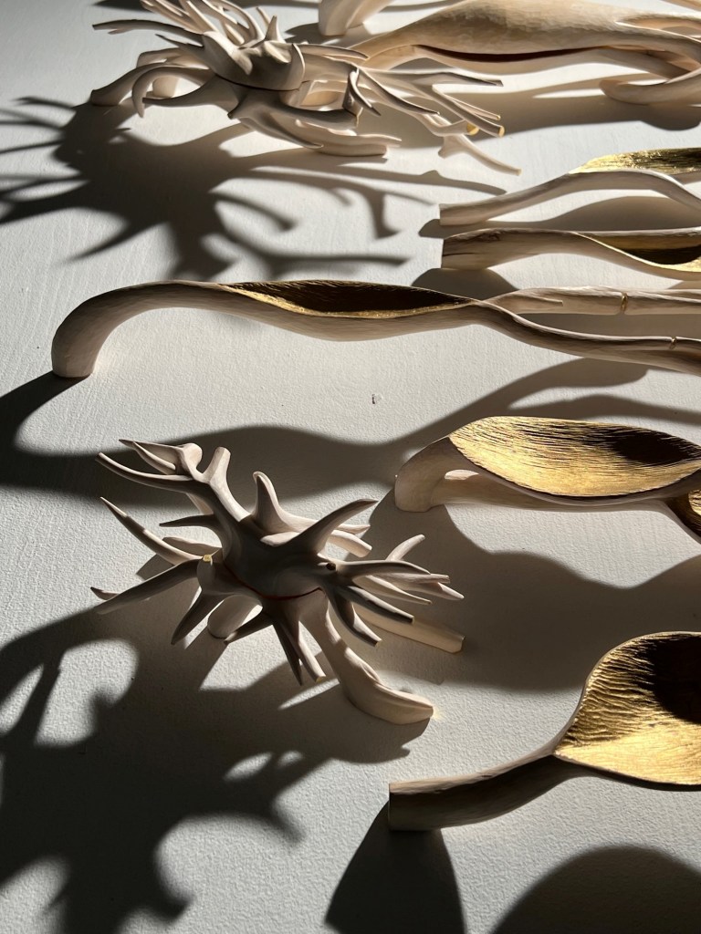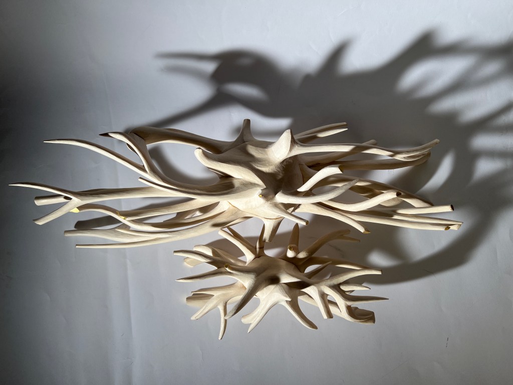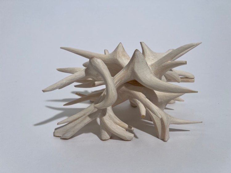 The objects in the Astrocyte Series, are much more complex in forms than the most complex object in my previous works in the Purkinje Series 2015-2021. As the star shaped astrocyte cells in our brain spreads in all directions, the objects in the Astrocyte Series similarly have end-feet striving towards all directions. Negotiating with the wood’s material affordances, some forms are not possible to make. However, illusions and approximations are possible. The overall impression of the Astrocytes suggests these star shapes and aim to make the observer wonder about how it was possible to visualize and carve out these shapes in such a brittle material.