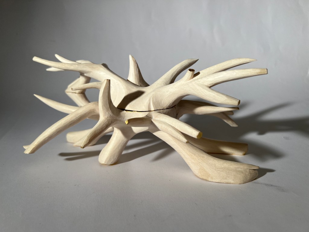 In this series I explored how to create forms inspired by the star-shaped astrocytes in aspen wood. Aspen wood is brittle and cross-grain-shapes will easily fall off. How do I go about carving such complex three-dimensional shapes out of one round log? The Astrocyte Series was a continuation of the Purkinje Series where I continued to stretch my skills in three-dimensional visualization and carving.