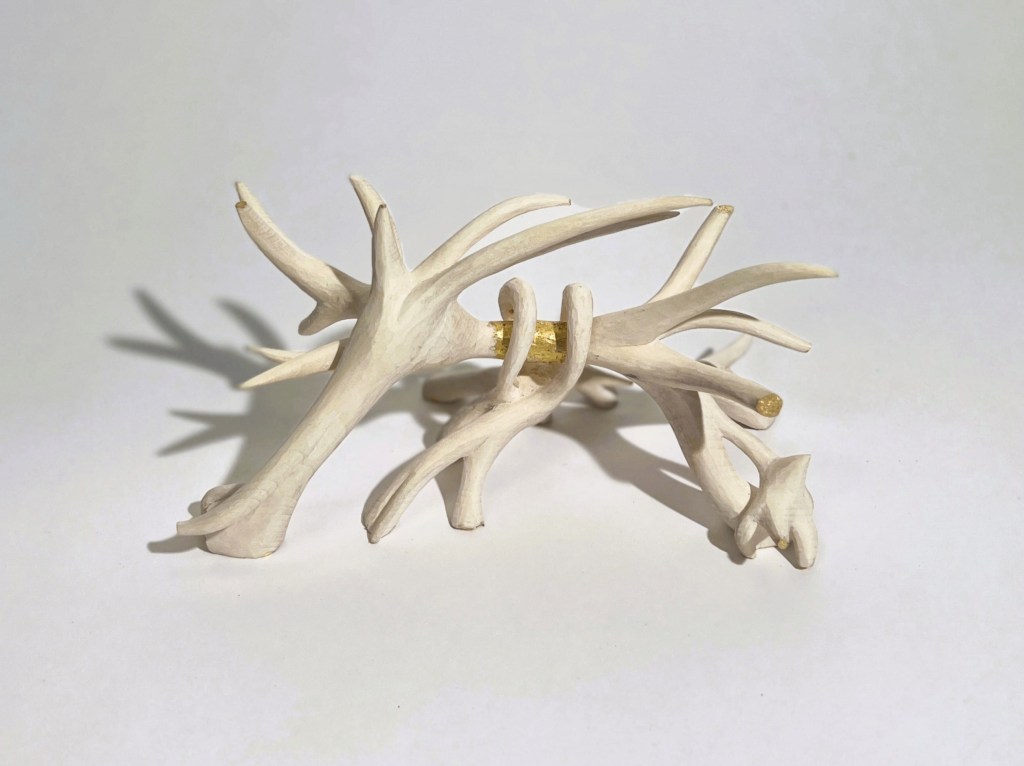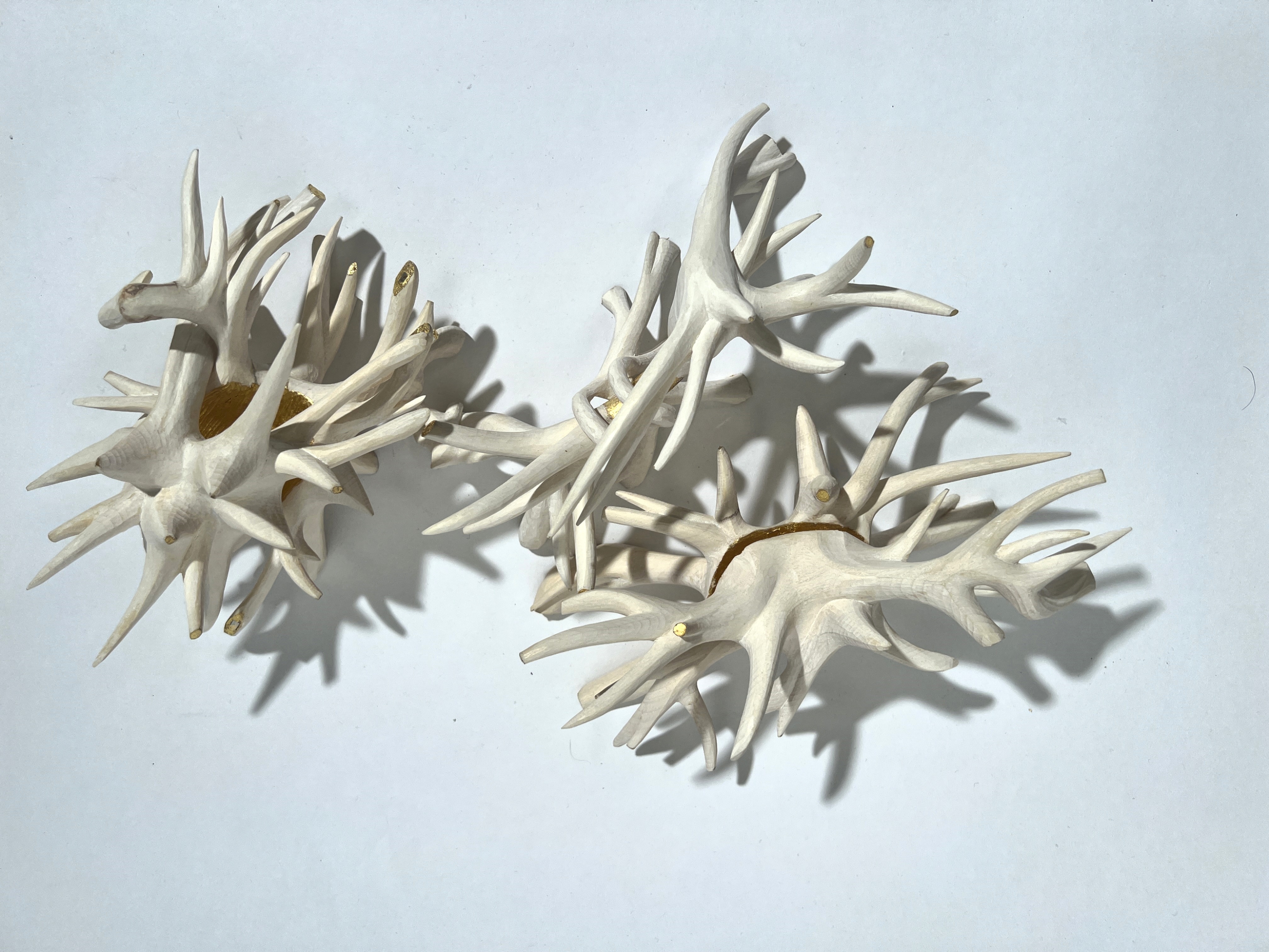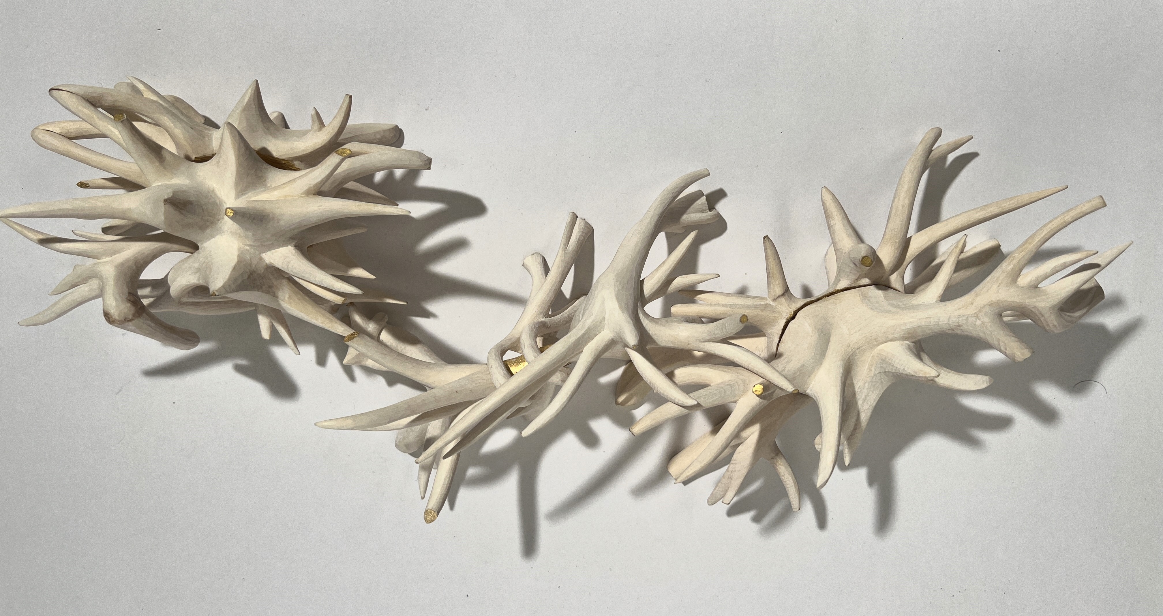 March 2025 the first sculpture was finished, Neural Connections #1. This sculpture represents a oligodendrocyte holding onto a neuron, and a micro glia clinging to one of the dendrites of the neuron. It is made in Aspen wood and embellished with 24k gold leaf.