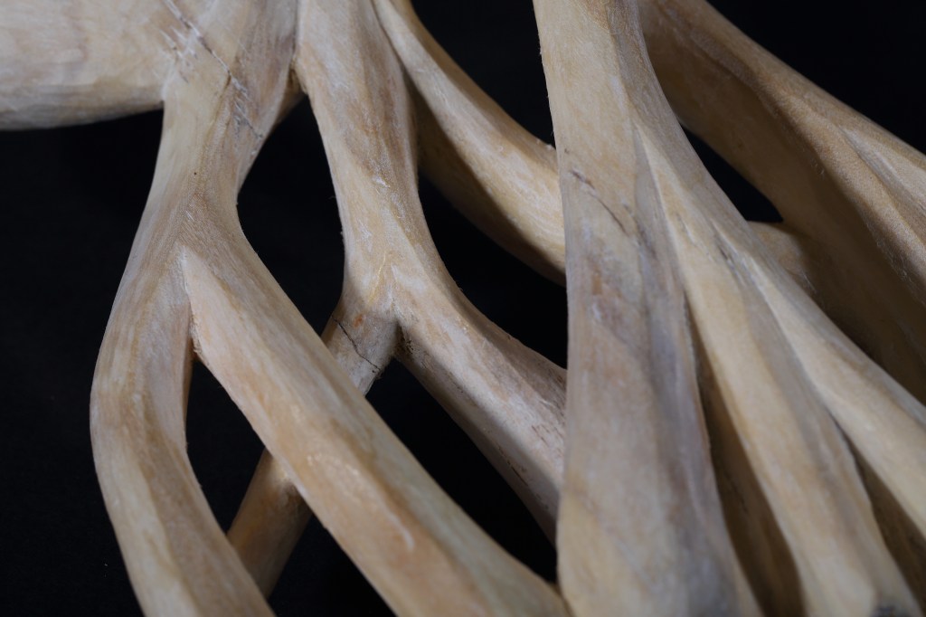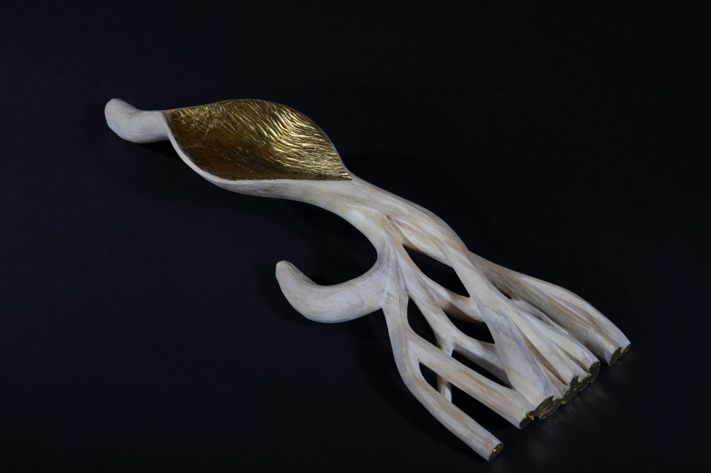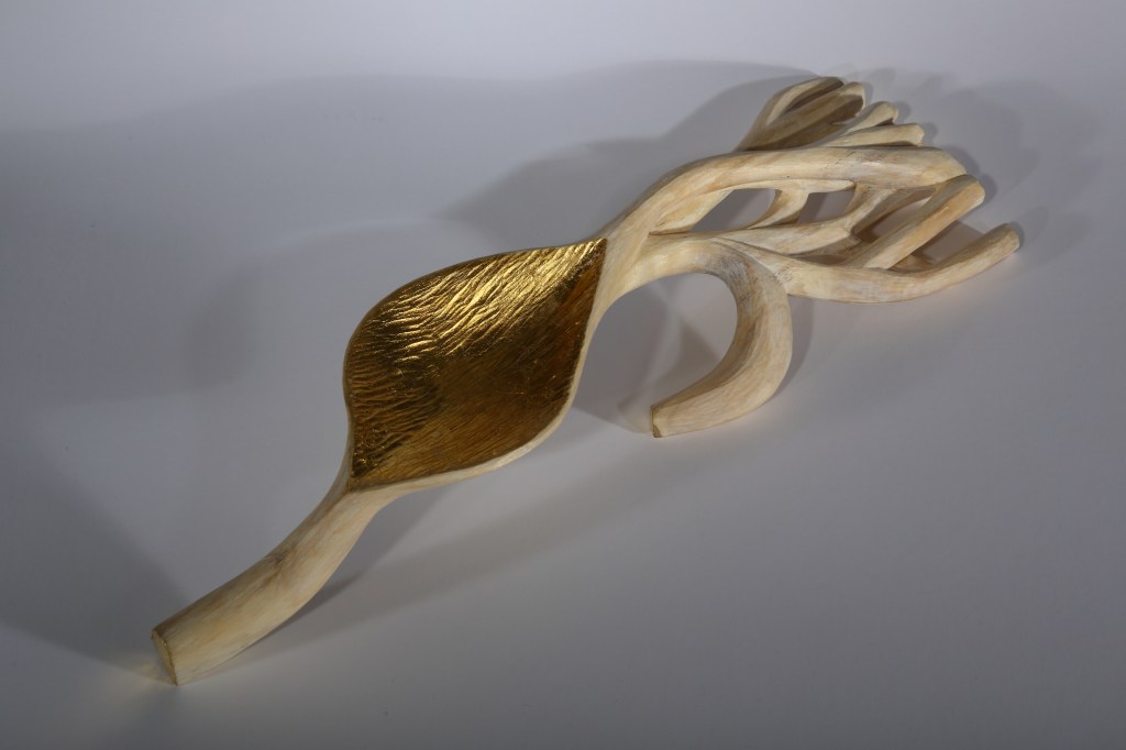 - Materials: Aspen wood from Telemark, Norway and gold leaf metal. Cut and waxed finish.