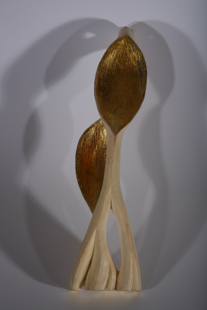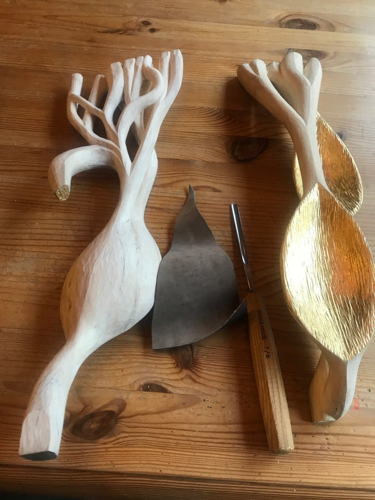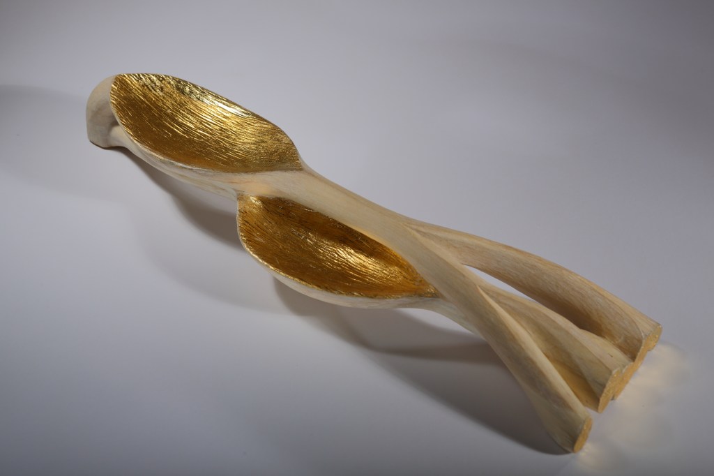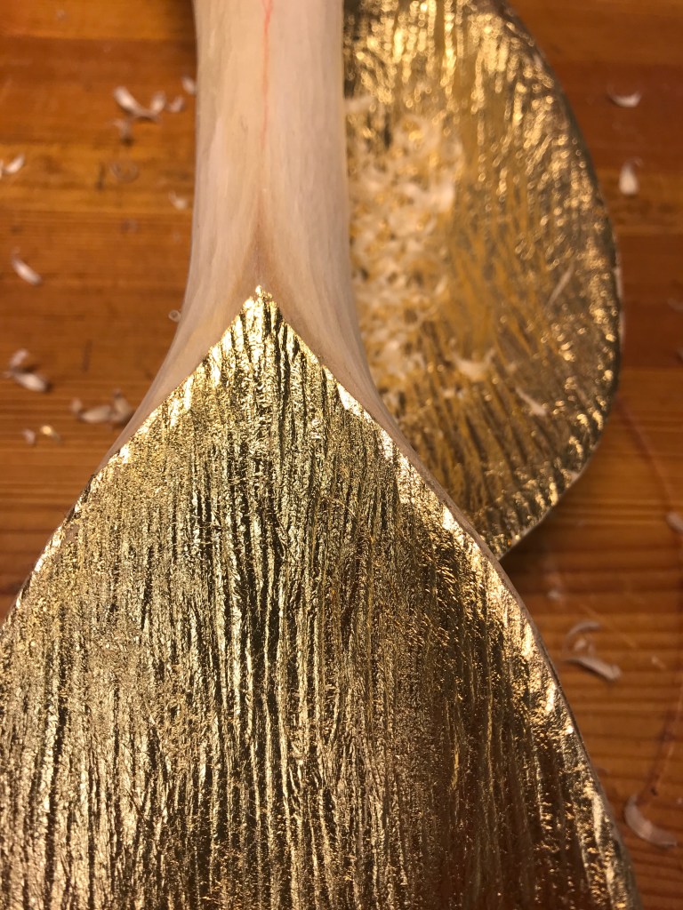 - Materials: Aspen wood from Telemark, Norway and gold leaf metal. Cut and waxed finish.