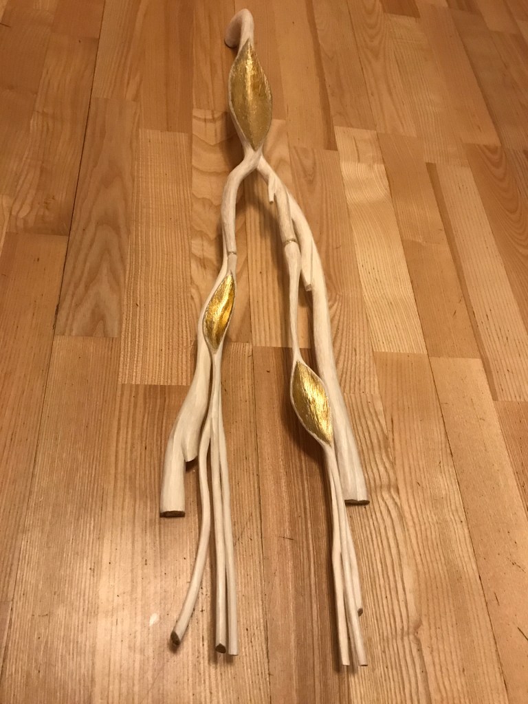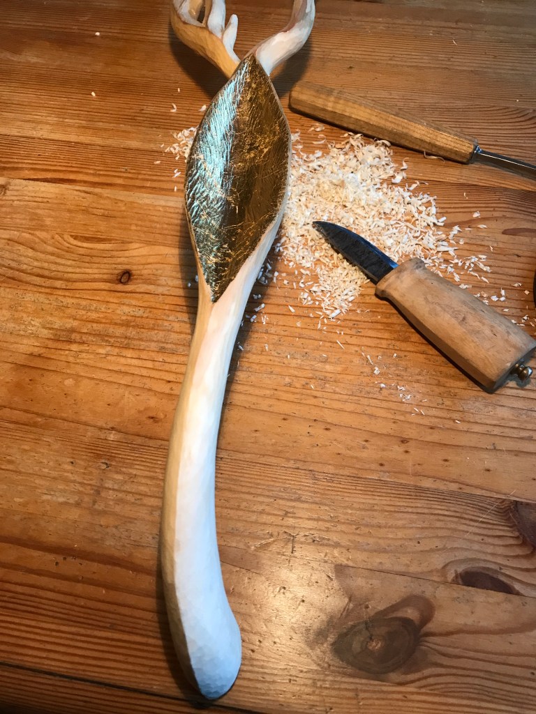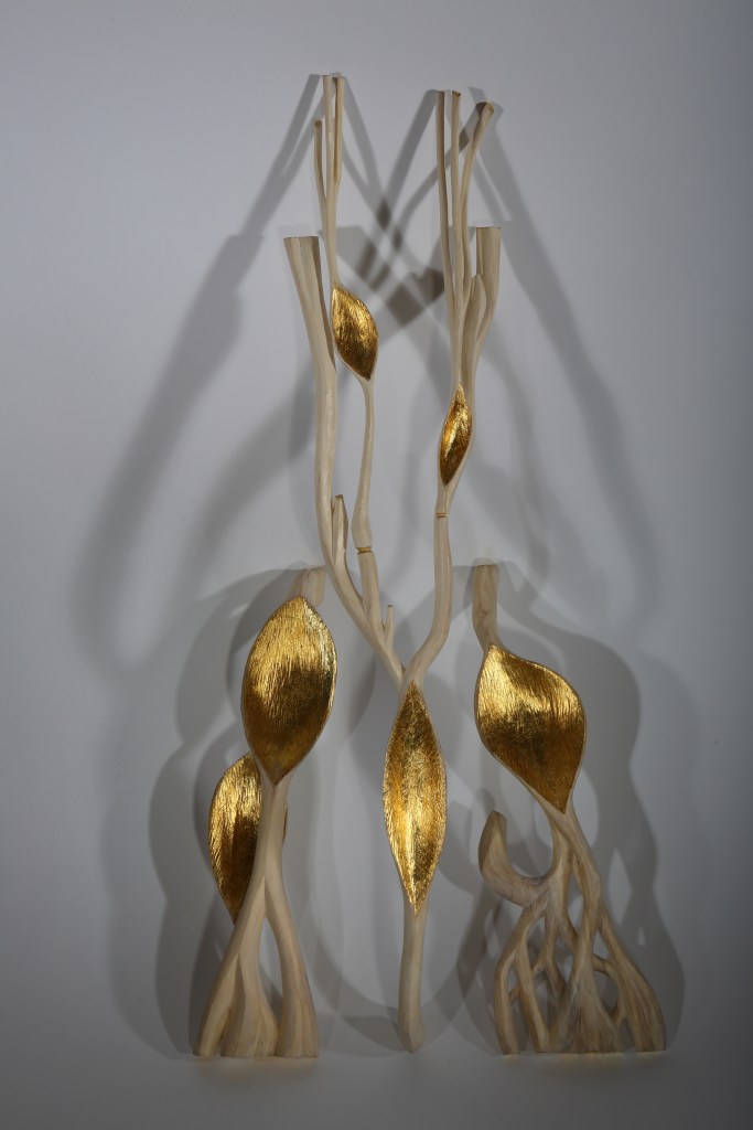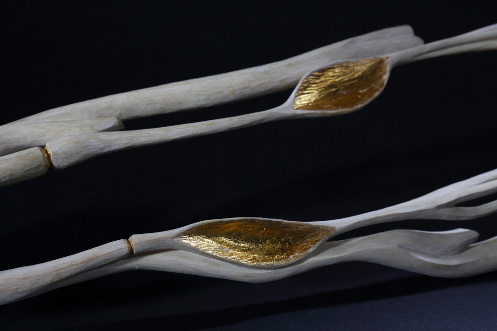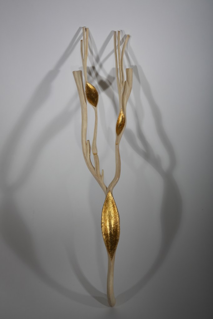 - Materials: Aspen wood from Telemark, Norway and gold leaf metal. Cut and waxed finish.