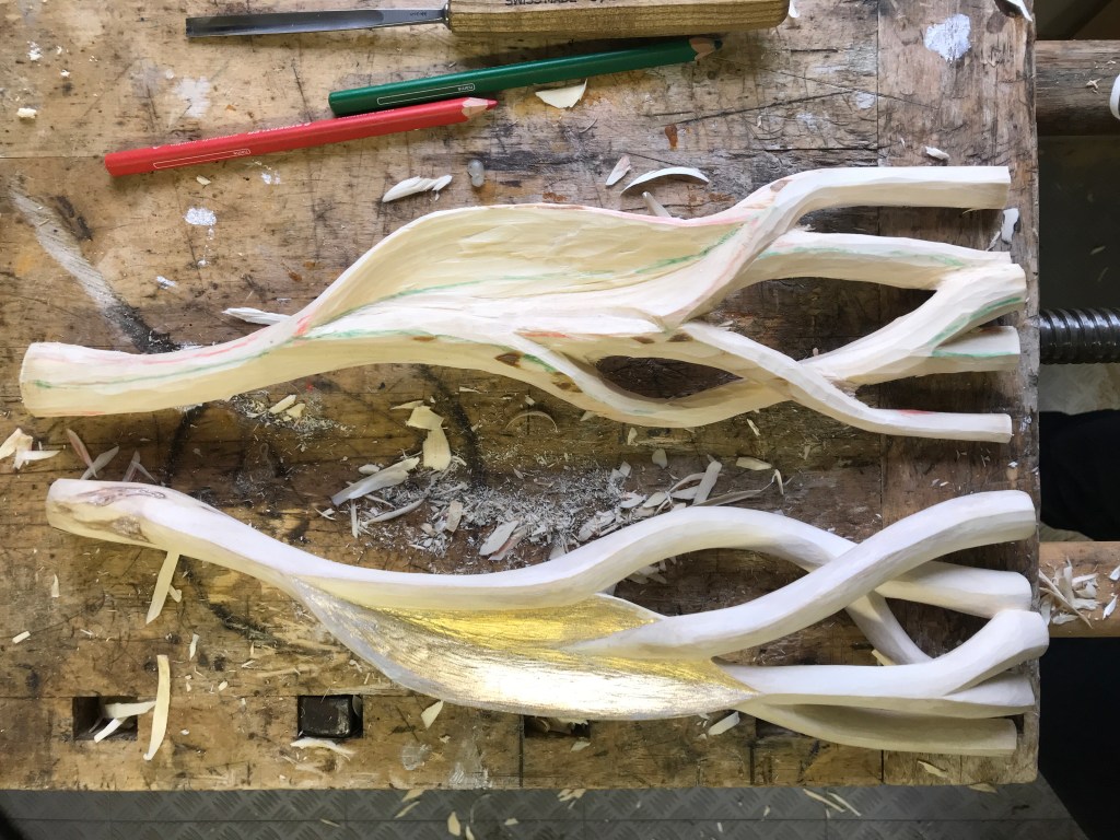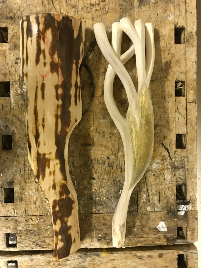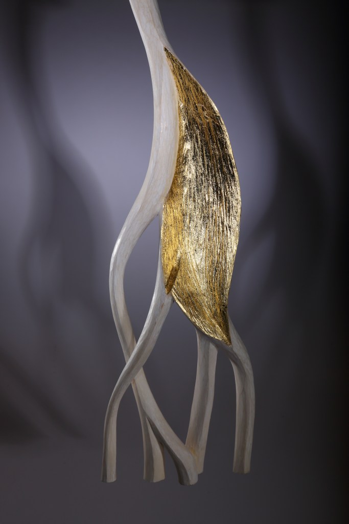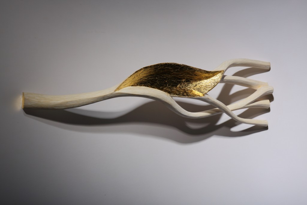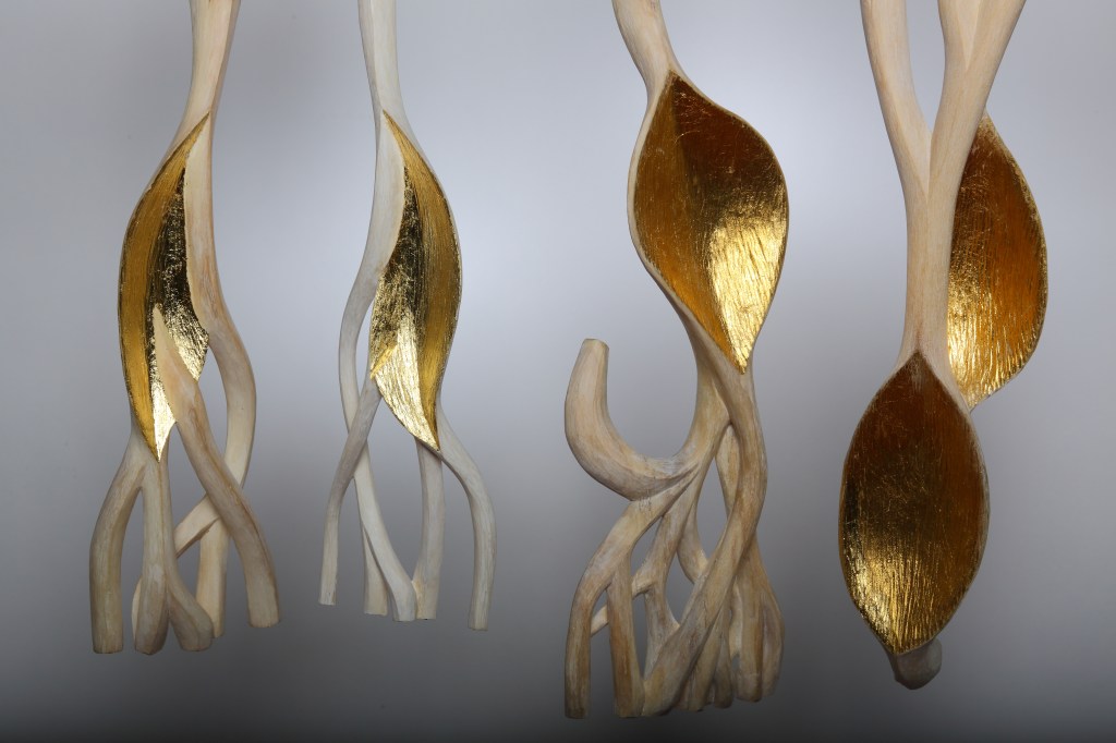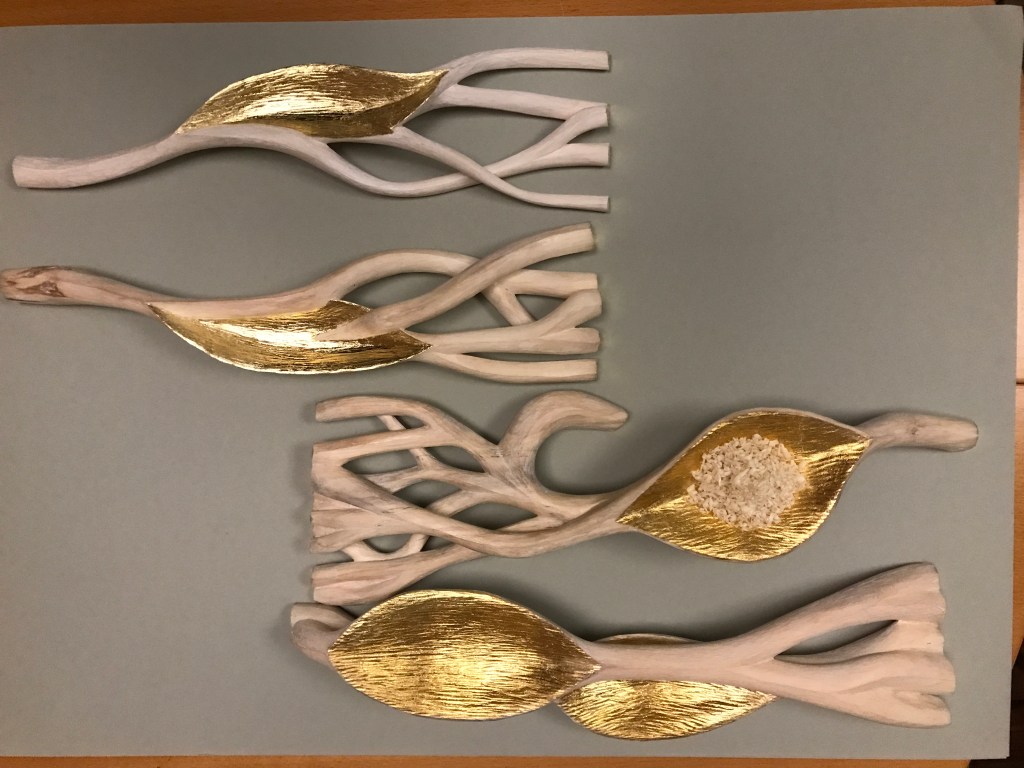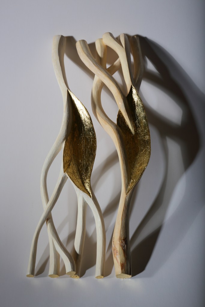 - Materials: Aspen wood from Telemark, Norway and gold leaf metal. Cut and waxed finish.