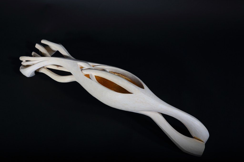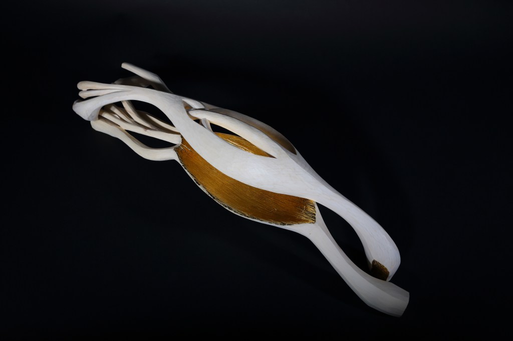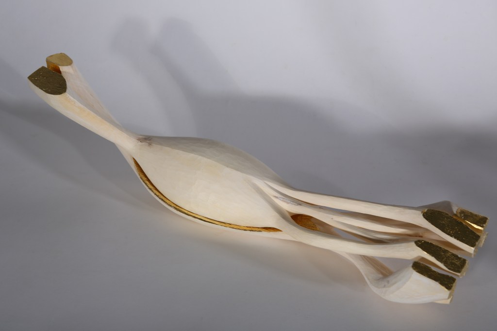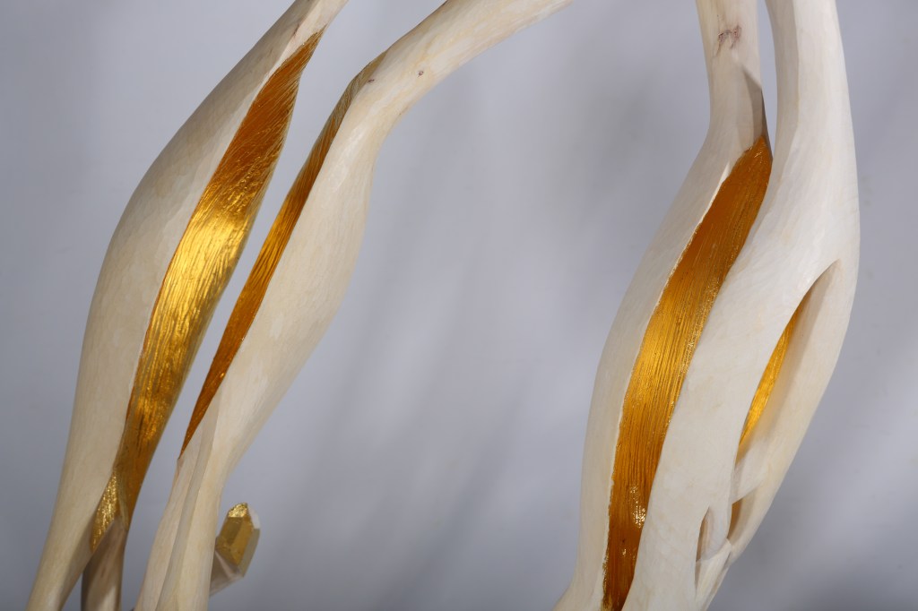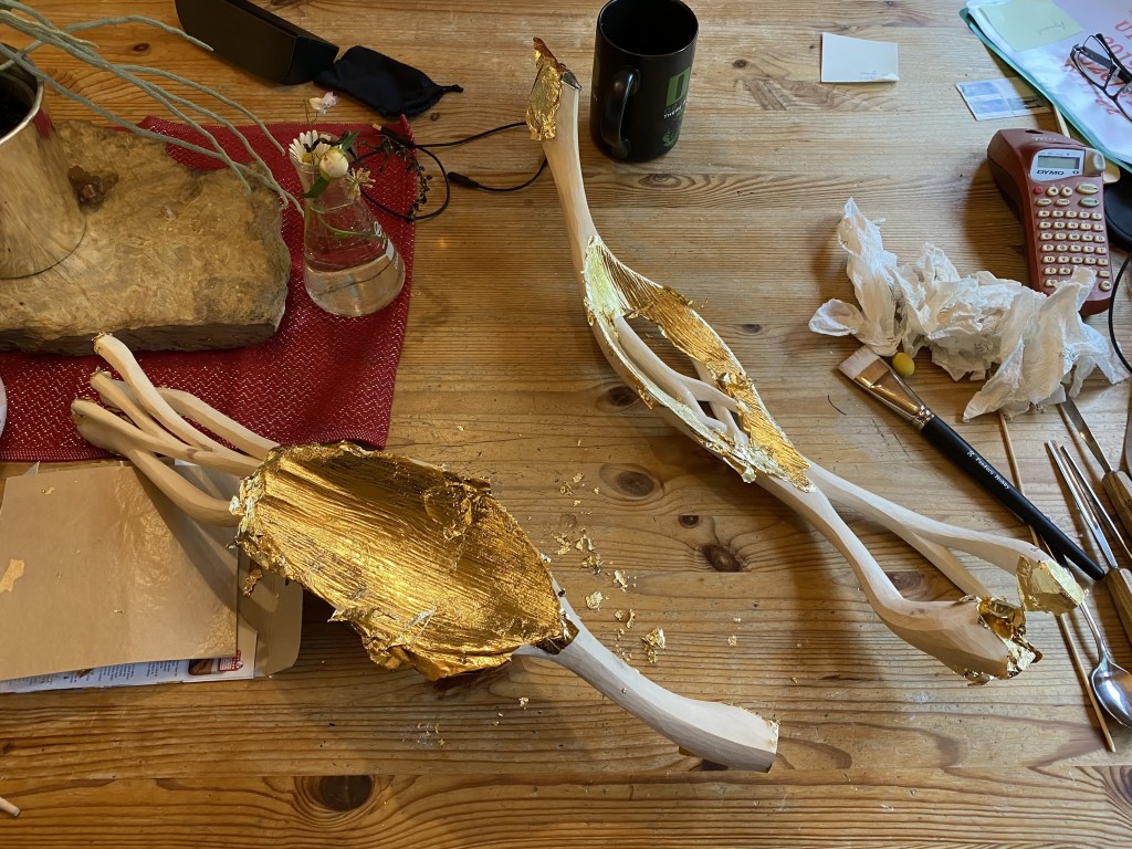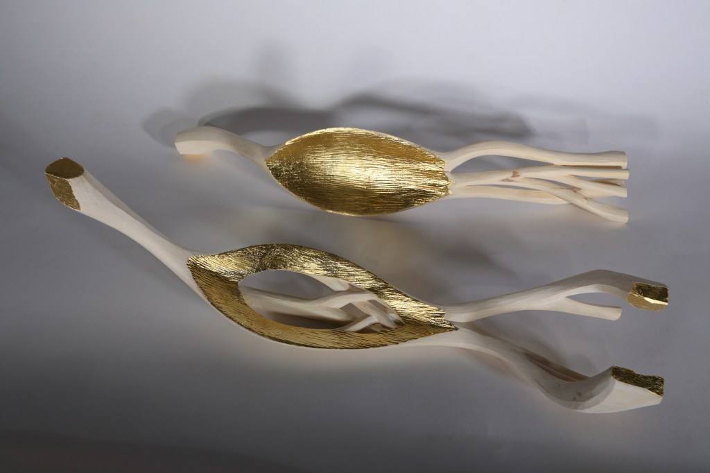 - Materials: Aspen wood from Telemark, Norway and gold leaf metal. Cut and waxed finish.