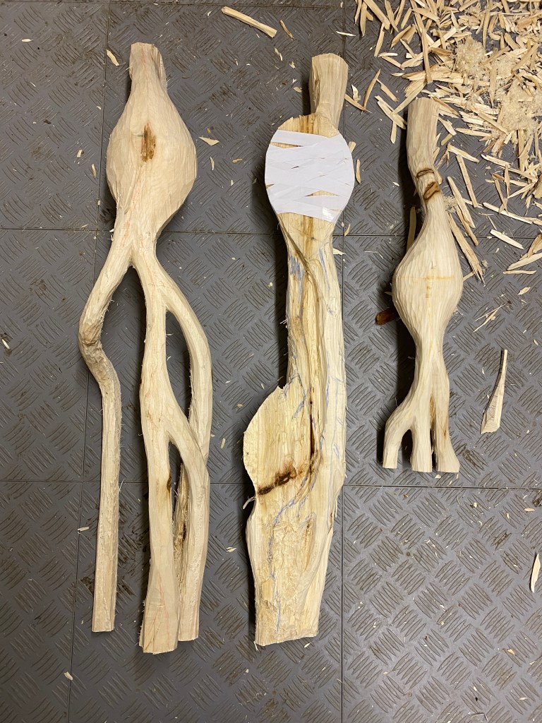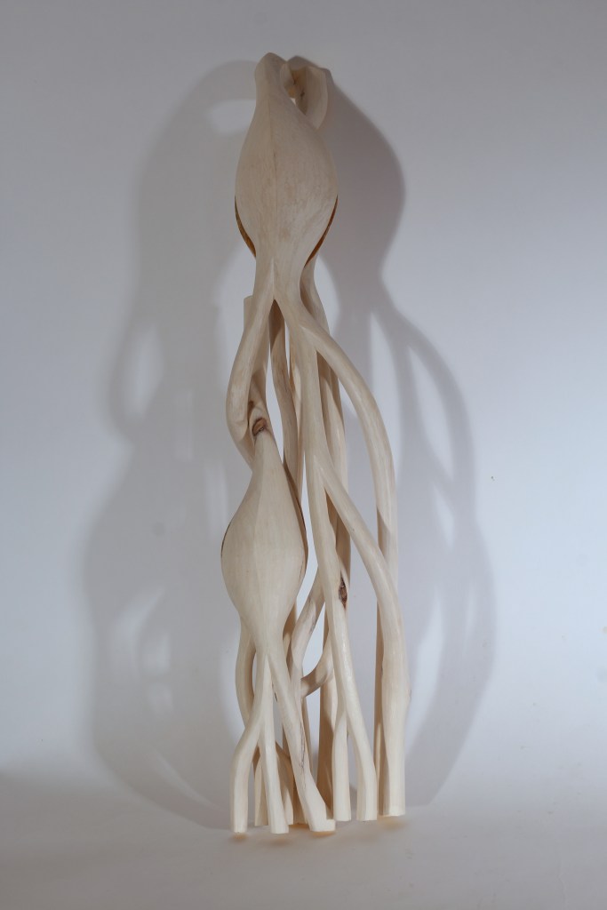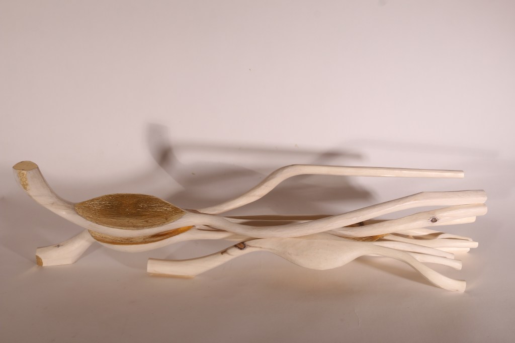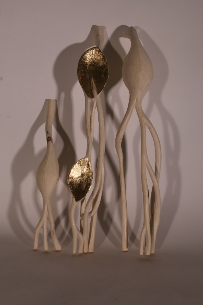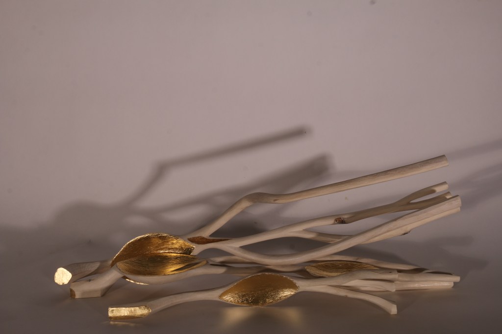 - Materials: Aspen wood from Telemark, Norway and gold leaf metal. Cut and waxed finish.