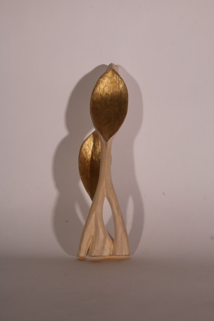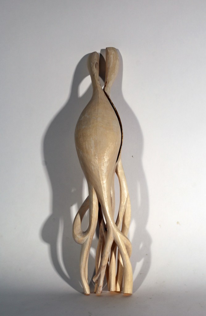 Some of the sculptures are in one piece. They are solid and stable. Others have multiple pieces which easily glides apart, and seem to want to fall to the floor when held. If they fall, the dry wood will splinter and fall in pieces, the entire artwork destroyed. The size and this challenge of keeping each piece together, represent how humans embraces the world and is embraced by the world, at the same time that we – by our actions – often set us apart from and above the world.